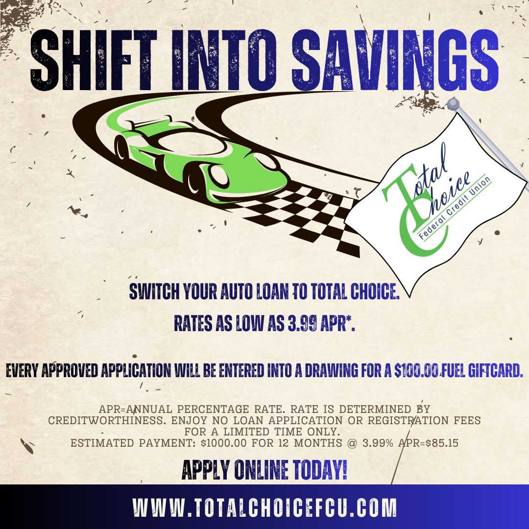 Switch your auto loan to Total Choice today! You’ll pay no registration or application fees. Rates as low as 3.99% APR*. Every approved loan will be entered into a drawing to win a $100.00 Fuel Giftcard. Apply here.